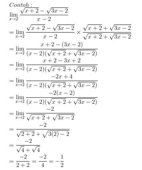 Contoh Soal Limit Perkalian Sekawan. Fungsi dikalikan dengan akar sekawannya agar bentuk limit tersebut tidak irasional, sehingga bisa dilakukan kembali substitusi langsung nilai. Metode ini digunakan jika pada metode substitusi langsung menghasilkan nilai limit yang irasional.